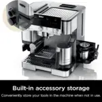 • BUILT-IN STORAGE: Conveniently store the tamper and funnel on the side of the machine when not in use, and keep brew baskets, brush, and cleaning disc in the built-in storage compartment.